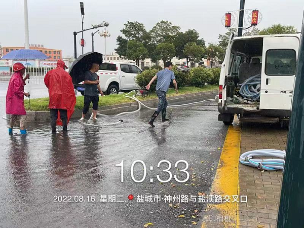 上午10點(diǎn),經(jīng)路面作業(yè)現(xiàn)場工作人員報(bào)告,在神州路與鹽瀆路交界處,最深積水達(dá)到15CM以上。應(yīng)急小分隊(duì)接到指令后,迅速駕駛車輛,運(yùn)載水泵、水管、鐵鍬等防汛物資,不到10分鐘就迅速趕到現(xiàn)場。在公司負(fù)責(zé)人劉鳳權(quán)、孫榮才等人的現(xiàn)場指揮下,搶險(xiǎn)人員立即查找造成堵塞積水的原因。經(jīng)過查找發(fā)現(xiàn),原來積水處只有一個(gè)下水道,無法快速排水。劉鳳權(quán)當(dāng)機(jī)立斷,指揮搶險(xiǎn)人員立即撬開附近窨井蓋,把水管放進(jìn)窨井,發(fā)動水泵,往不遠(yuǎn)處的雨水井排水。這時(shí)雨越下越大,風(fēng)越刮越猛,搶險(xiǎn)隊(duì)員們冒著狂風(fēng)暴雨,不畏雷鳴電閃,齊心協(xié)力清理積水,有的發(fā)動水泵梳理管道;有的用大掃帚清掃路面積水;有的清理積水中的垃圾雜物……隊(duì)員各司其職,分工合作,在時(shí)間緊迫、環(huán)境惡劣的情況下盡力完成排水作業(yè),經(jīng)過緊急搶排,道路恢復(fù)了通暢。