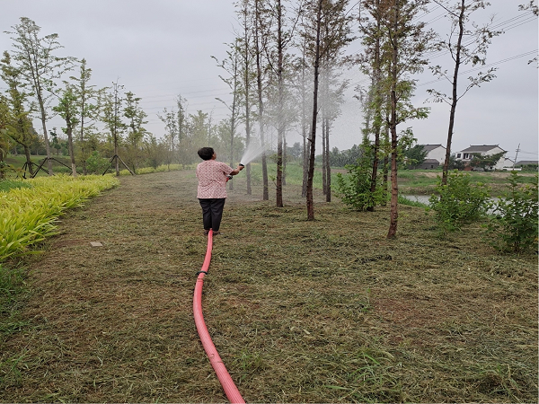 在晴熱少雨的日子,夏季植物生長茂盛,各類雜草長勢迅猛,清除雜草也是當下綠地養(yǎng)護的一大任務。在天氣熱、任務重、困難多的情況下,綠化養(yǎng)護隊伍根據植物需求,堅持科學管理、序時作業(yè)、精心維護,有的在澆水除草,有的在松土施肥,有的在修枝剪葉……廊道兩岸一派忙碌的勞動景象。在隊員們的精心呵護下,蟒蛇河水上文化生態(tài)廊道呈現一片欣欣向榮的綠色生機。