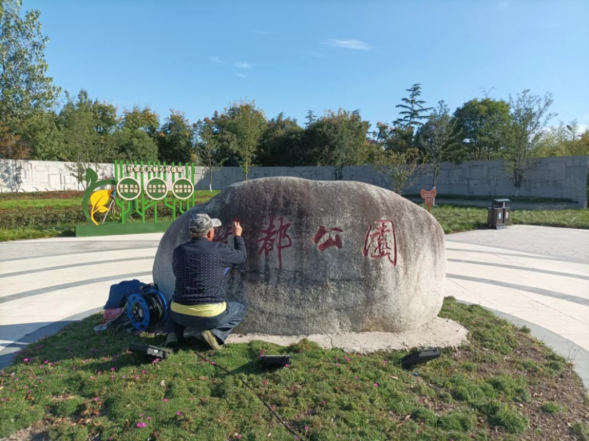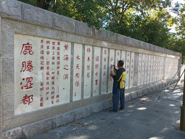 潤都公園主入口的特色浮雕景墻上嵌有“鶴舞東方”、“鹿騰濕都”等字樣,設計方案充分融入鹽城地方元素,以“鶴”、“鹿” 為主題,結合優(yōu)雅靈動的浮雕畫,突出鹽城濕地廣闊、物種豐富、生態(tài)良好的特點,充分體現(xiàn)了鹽城自然環(huán)境的優(yōu)越性。 美景共賞,更需要共同去維護。近日,公園工作人員對東門入口特色浮雕景墻和北門入口景觀石進行清洗打磨、破損修復、字樣出新等處理。翻新工作保護了經自然侵蝕的磨損景觀,改變了長久以來暗淡的色彩,也提升了公園入口景觀效果。